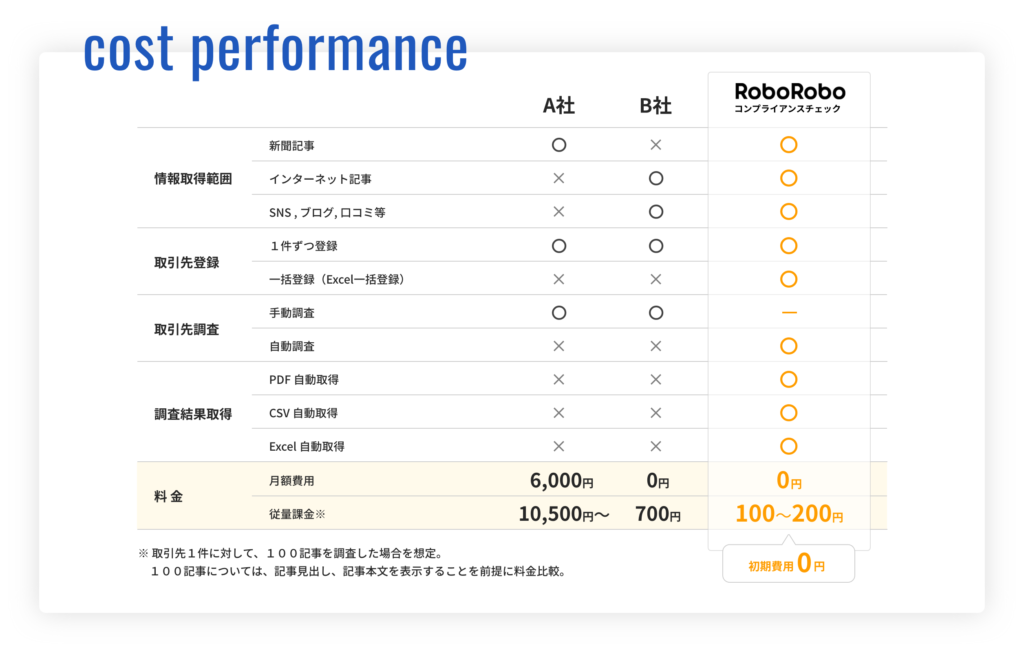 ゼロ円ゼロ円 で 反社チェック 業務をDX化 無料で試してみる 断トツの実績 : 継続率 99% 超 上場企業 に求められるコンプライアンスチェックにも万全対応 この品質にして 初期費用0円 月額固定費0円 断トツの実績 : 継続率 99% 超 上場企業 に求められるコンプライアンスチェックにも万全対応 この品質にして 初期費用0円 月額固定費0円 動画再生 無料で試してみる 資料ダウンロード 導入企業5,000社以上 継続率99%超 私たちがRoboRoboをお勧めする理由 私たちがRoboRoboをお勧めする理由 反社チェックの効率化だけでなく、API連携により既存システムとのシナジーも 三菱地所ハウスネット(株) 以前の反社チェック業務は、インターネット検索等を行い、担当者が内容を確認して判断するというのが従来の反社チェック業務だったんです。 この反社チェック作業は、対象者1件あたりおおよそ8.4分でした。 それが、RoboRoboコンプライアンスチェックを導入することで、今の時点では1分程度にまで短縮されました。 単純に検索等をするという行為と、その証跡を保存する行為のすべてが削減できており、残りは「判断する」という作業のみになりました。 さらに詳しく 1件当たりの作業時間を約30分の1に短縮。UIがとにかく見やすく使いやすい サイバードグループ 反社・コンプライアンスチェックの量が多く、手間も時間もかかる中で、心理的な負担も増大していましたので、何か良いサービス等はないのかずっと探していたところ、ある時、人伝にRoboRoboコンプライアンスチェックという便利なサービスがあると耳にしました。 すぐに比較サイト等でサービス内容を調べたところ、作業効率だけではなく、コストの面でも当社にとってとても魅力的なサービスだとわかりました。そうした感想はその後、営業担当の方の話を聞いて信頼できるサービスであるとの確信へと変わり、RoboRoboコンプライアンスチェックの導入を決定しました。 さらに詳しく 大きな負担となっていたコンプライアンスチェックにかかる時間を約80%削減に成功 リンカーズ株式会社 RoboRoboコンプライアンスチェックを知った最初のきっかけは、知り合いの企業法務担当の方から評判を聞いたことです。そこから検索して、概要などを調べていきました。 その後、2週間のトライアルをさせていただいた結果、RoboRoboコンプライアンスチェックを活用することで、当社のような限られたリソースの中にあっても、反社・コンプライアンスチェックの品質を担保しつつ、担当者がやらなくていい部分を自動化できると判断しました。 これにより、先ほどお話しした法務部門としての本来の業務に当てる時間を創出することを目指し、またサービスの使い勝手もふまえて、Roboroboコンプライアンスチェックの導入を決断しました。 さらに詳しく RoboRoboと他社との違い RoboRoboと他社との違い 無料で試してみる 資料ダウンロード 運営会社:オープンアソシエイツ株式会社info@roborobo.co.jp © Open Associates All Rights Reserved.